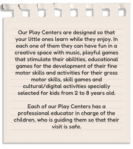 Every month we have different activities in our Play Centers so that the little ones can have fun while you live the experience. You can check the month activity at the branches.